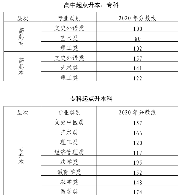 2020年北京市成人高校招生录取最低控制分数线